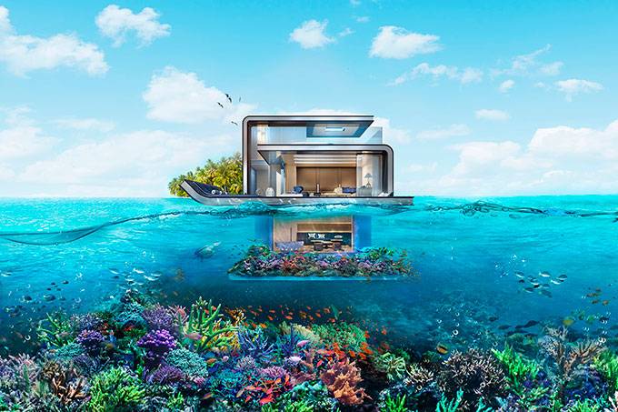Esse é o destemido projeto do Kleindienst Group, empresa de infraestrutura e engenharia dos Emirados Árabes, que está construindo um condomínio de casas subaquáticas em um conjunto de ilhas em Dubai.